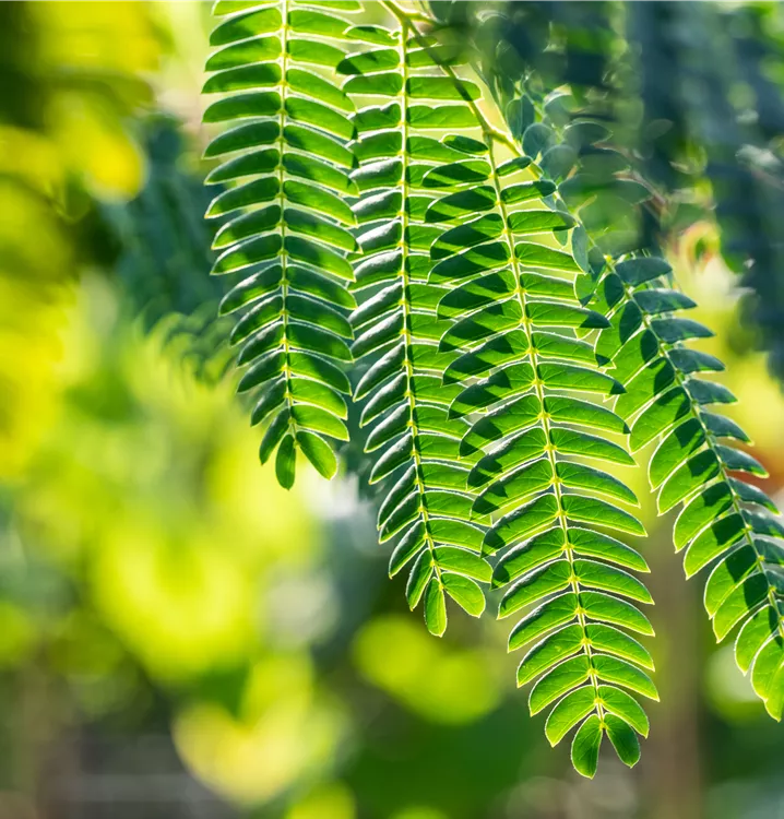 Die sommergrünen Blätter des Seidenbaums sind mittelgrün, gefiedert. Seidenbaum zeigt sich leuchtend gelb-grün im Herbst.