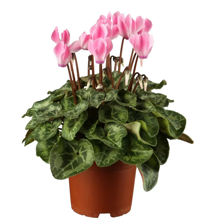 Das Zimmer-Alpenveilchen (Cyclamen persicum) ist eine weiß, pink, rosa, rot, dunkelrot oder lila blühende Pflanze, die herzförmige, mehrfarbige, gezähnte Blätter trägt. Seine Blüten verströmen einen angenehmen Duft und erscheinen von September bis April. Diese aufrechte und dichte Pflanze gedeiht am besten an einem sonnigen bis halbschattigen Standort.