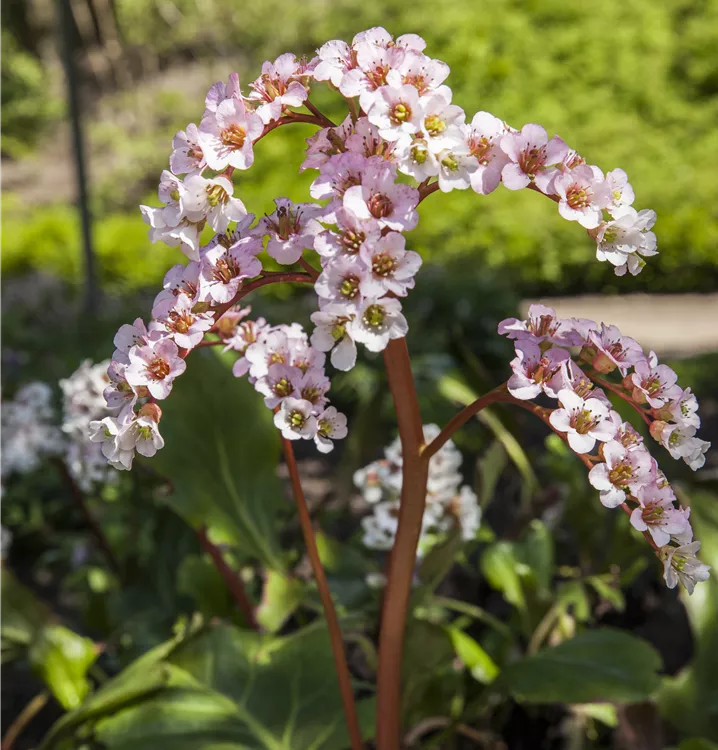 Bergenia cordifolia bildet glockenförmige, in Dolden angeordnete, rosafarbene Blüten ab April. Bei richtiger Pflege Nachblüte von November bis Dezember.