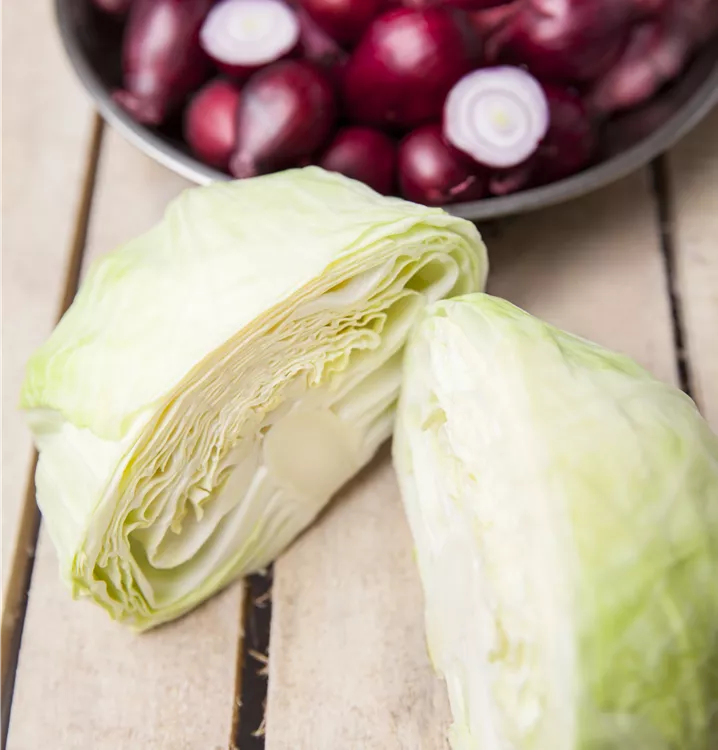 Der Weißkohl (Brassica oleracea var. capitata) ist eine würzig schmeckende Gemüsepflanze. Seine Blätter können geerntet werden, sobald er ca. 30 cm erreicht hat. Für das optimale Wachstum des Weißkohls werden ein sonniger Standort und durchlässiger, nährstoffreicher Boden benötigt.