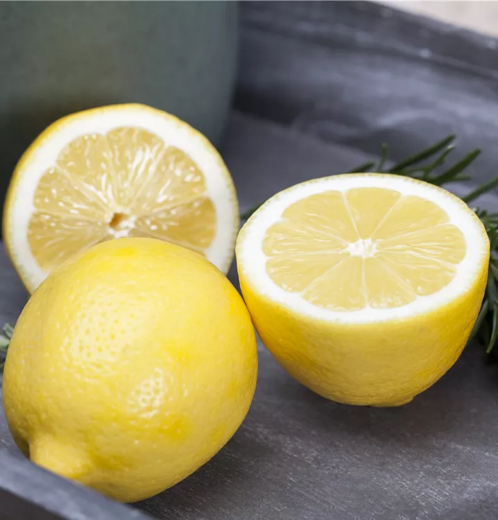 Besonders dekorativ sind die gelben Früchte von Citrus limon. Diese erscheinen ab Juli.