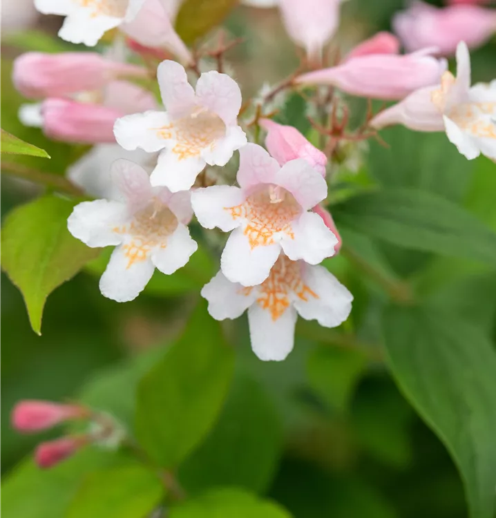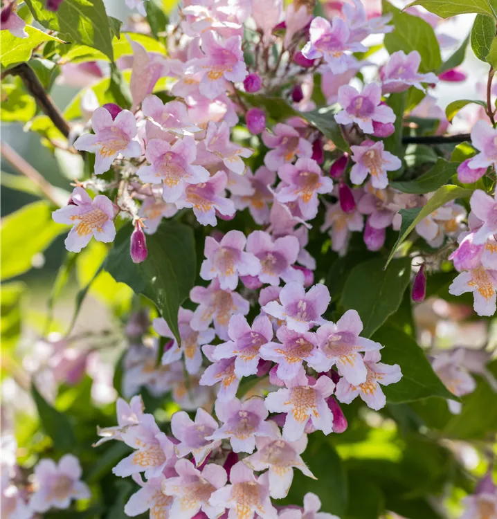 Der Perlmuttstrauch (Kolkwitzia amabilis) ist ein überhängender Strauch, der hellrosafarbene, trichterförmige, in Doldentrauben angeordnete Blüten mit einem angenehmen Duft hervorbringt. Sie erscheinen von Mai bis Juni. Aus diesen gehen dunkelgraue Früchte hervor. Sie verströmen einen angenehmen Duft. Zudem trägt der Perlmuttstrauch, lanzettliche, mittelgrüne Blätter. Seine Rinde ist rot-braun, abblätternd. An einem sonnigen bis halbschattigen Standort erreicht er gewöhnlich eine Höhe von ca. 4 m und wird ca. 3 m breit. An den Boden stellt der Perlmuttstrauch keine besonderen Ansprüche.