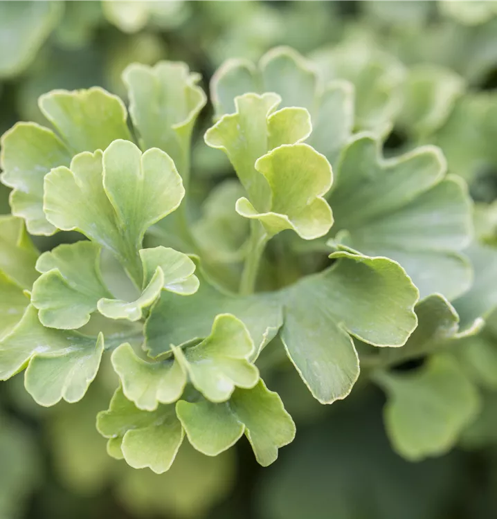 Der Fächerblattbaum 'Mariken' (Ginkgo biloba) ist ein Kleinstrauch, welcher kugelförmig wächst und gewöhnlich eine Höhe von ca. 1,5 m und eine Breite von ca. 2 m erreicht. Seine fächerförmigen, matten, ledrigen Blätter haben eine mittelgrüne Färbung. Sie verwandeln sich im Herbst in ein schönes Gelb. Dieses Gehölz ist gut frostverträglich.Er bevorzugt humosen, nährstoffreichen, sandigen Boden in sonniger bis halbschattiger Lage.