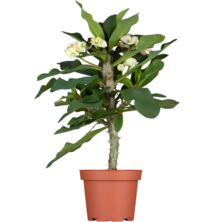 Der Christusdorn (Euphorbia milii) ist eine Pflanze mit mittelgrünen, lanzettlichen Blättern. Seine tellerförmigen Blüten sind rot und erscheinen in Trugdolden von November bis April. Diese kompakte und strauchartige Pflanze gedeiht am besten an einem sonnigen Standort.
