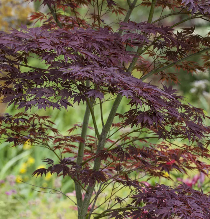 Die purpurroten Blüten des Fächerahorn erscheinen in Trauben im Mai.