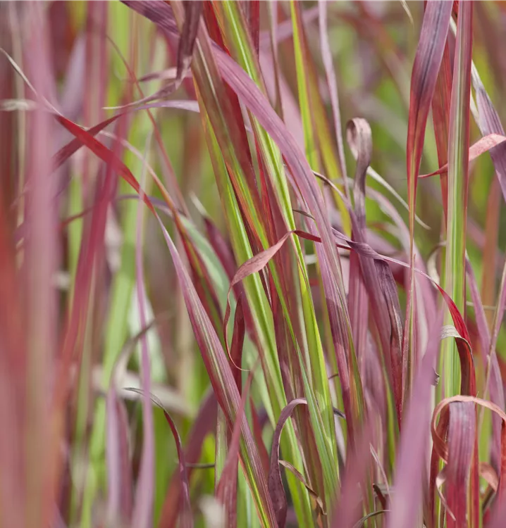 Hoher Blattschmuckwert. Die sommergrünen Blätter des Garten-Blutgrases 'Red Baron' sind grün-rot, lineal. Garten-Blutgras 'Red Baron' zeigt sich leuchtend rot im Herbst.