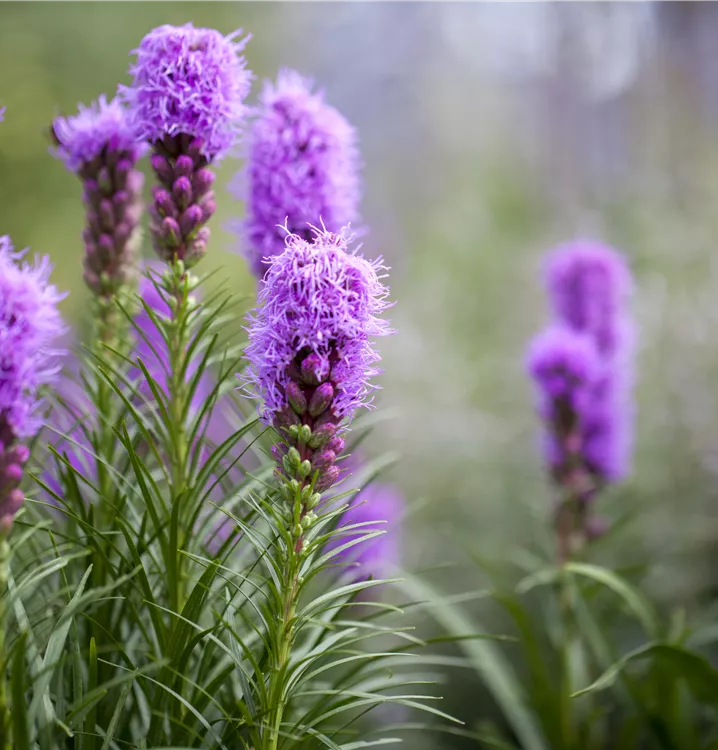 Liatris spicata bildet in Ähren angeordnete, violette Blüten ab Juli.