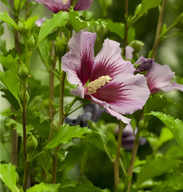 Der Roseneibisch (Hibiscus syriacus) ist ein aufrechter Strauch, der lilafarbene, rote, blaue oder weiße, schalenförmige Blüten hervorbringt. Sie erscheinen von Juli bis September. Zudem trägt der Roseneibisch, eiförmige, mittelgrüne Blätter. Seine Rinde ist grau. An einem sonnigen bis halbschattigen, windgeschützten Standort mit durchlässigem, nährstoffreichem Boden erreicht er gewöhnlich eine Höhe von ca. 3 m und wird ca. 1,5 m breit.