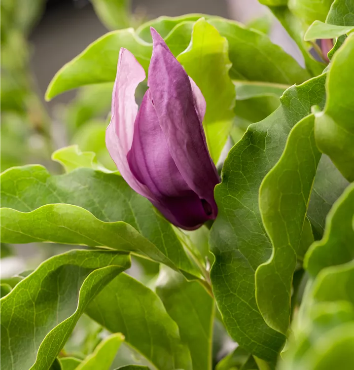 Die sommergrünen Blätter der Purpurmagnolie sind dunkelgrün, eiförmig, glänzend.