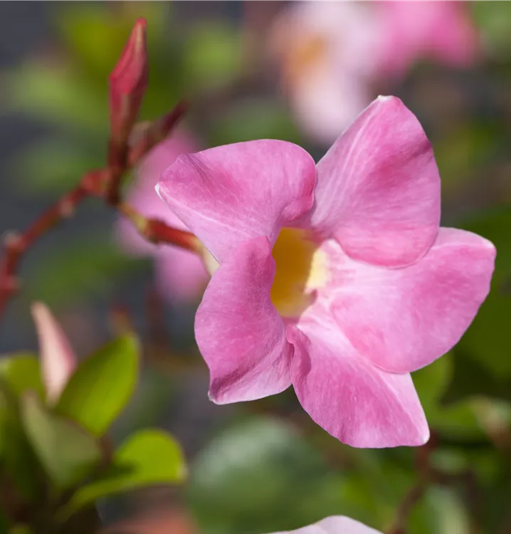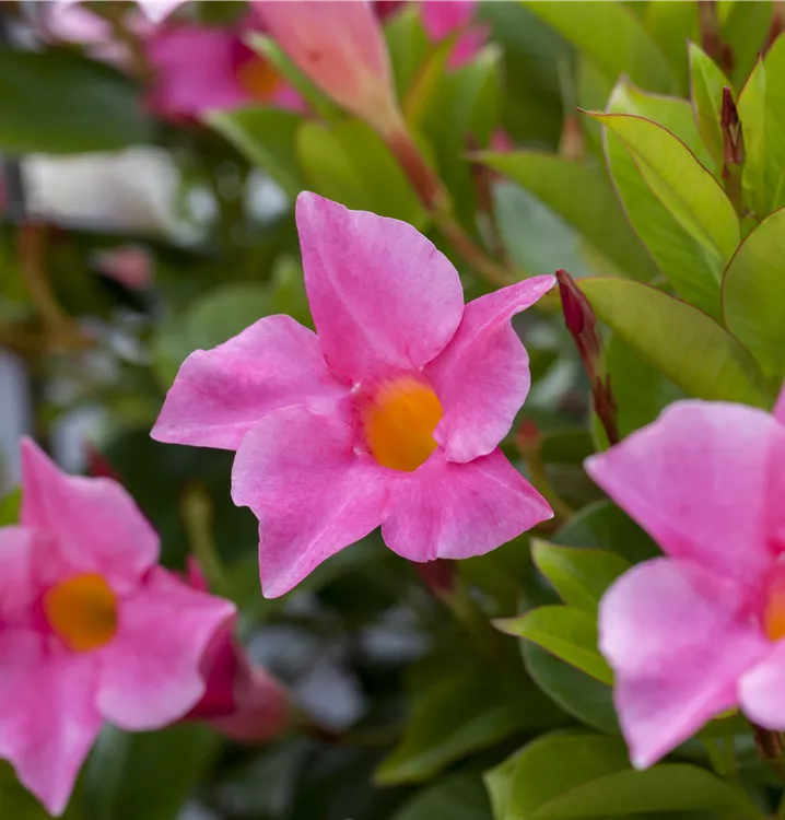Der Brasiljasmin (Mandevilla sanderi) ist eine sehr beliebte, immergrüne Kübelpflanze. Seine dekorativen Blüten sind trichterförmig und erscheinen von Juni bis September. Die dunkelgrünen Blätter sind eiförmig und glänzend. Der Standort sollte möglichst sonnig bis halbschattig sein. Eine durchlässige und lockere Erde ist dabei ideal. Bei günstigen Bedingungen erreicht der Brasiljasmin eine Höhe von ca. 2 m und wird bis zu 1,5 m breit.