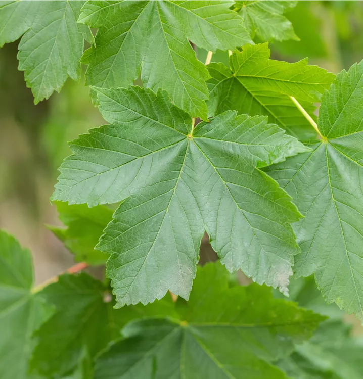 Die sommergrünen Blätter des Bergahorns sind dunkelgrün, gegenständig, gelappt. Bergahorn zeigt sich leuchtend goldgelb im Herbst.