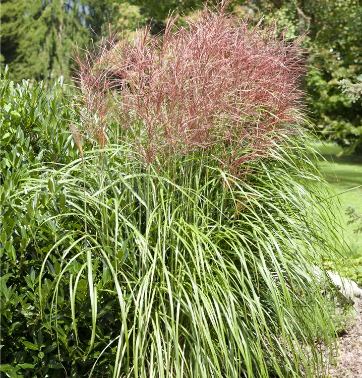 Das Garten-Chinaschilf (Miscanthus sinensis) ist mit seiner mittelgrünen Blattfärbung ein dekoratives Gestaltungselement im Garten, welches ebenso mit seinem aufrechten Wuchs hervorsticht. Die cremeweißen bis braunen Blütenrispen schmücken diese Gras ab Herbst. An einem sonnigen bis halbschattigen Standort mit einem möglichst durchlässigen, humosen, nährstoffreichen Boden fühlt es sich am wohlsten. Bei günstigen Bedingungen erreicht dieses winterharte Gras eine Höhe von ca. 1,2 m und wird bis zu 80 cm breit.