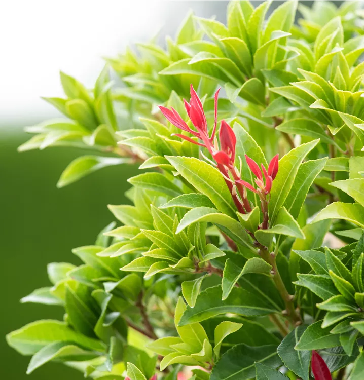 Das Schattenglöckchen 'Mountain Fire' (Pieris japonica) ist ein buschiger, breiter, dichter Kleinstrauch, der weiße, in Rispen angeordnete Blüten hervorbringt. Sie erscheinen von März bis Mai. Zudem trägt das Schattenglöckchen 'Mountain Fire', glänzende, lanzettliche, dunkelgrüne Blätter. Der dunkelrote Austrieb ist ebenso ein interessanter Anblick. An einem halbschattigen bis schattigen, windgeschützten Standort mit humosem, nährstoffreichem Boden erreicht es gewöhnlich eine Höhe von ca. 1,3 m und wird ca. 1 m breit.