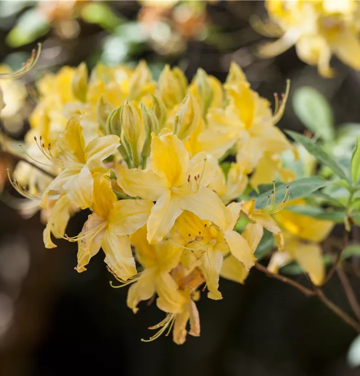 Die gelben, trichterförmigen Blüten der Laubabwerfende Azalee erscheinen in Dolden von Mitte Mai bis Ende Juni. Diese sind stark duftend.