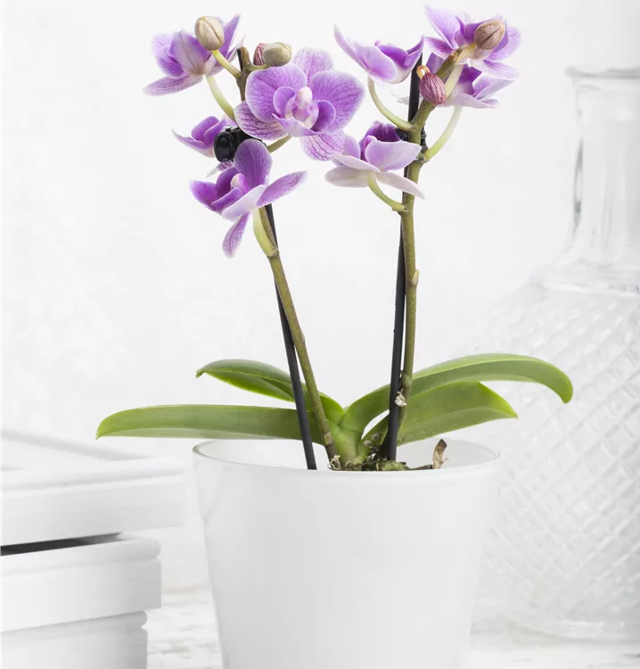 Die Mini-Schmetterlingsorchidee (Phalaenopsis) ist eine schöne, in weiß, rosa, hellgelb, pink oder dunkelrot blühende Orchidee. Ihre lippenförmigen Blüten sind sehr dekorativ und erscheinen in Rispen von Januar bis Dezember. Mit ihrem aufrechten und rosettenartigen Wuchs wird sie bis zu 20 cm hoch und 20 cm breit. Für das optimale Wachstum sorgen ein heller Standort sowie eine möglichst durchlässige und lockere Erde.