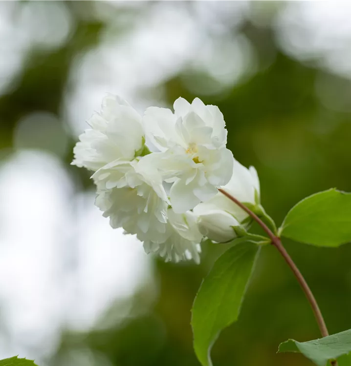 Die weißen, starkgefüllten, schalenförmigen Blüten des Gartenjasmin 'Schneesturm' erscheinen in Trauben von Juni bis Juli. Diese werden etwa 4 - 5 cm groß und sind stark duftend.