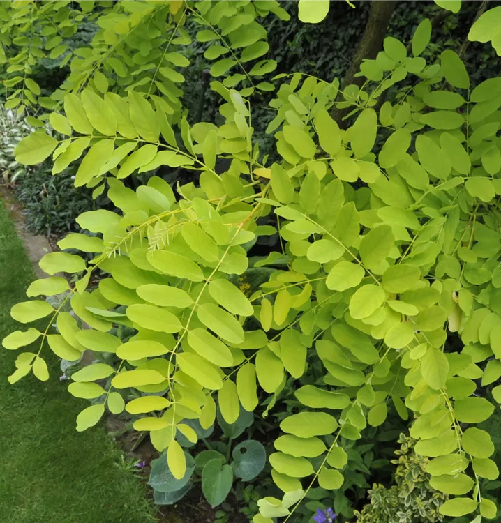 Die sommergrünen Blätter der Scheinakazie sind dunkelgrün, gefiedert, wechselständig. Scheinakazie zeigt sich leuchtend gelb im Herbst.