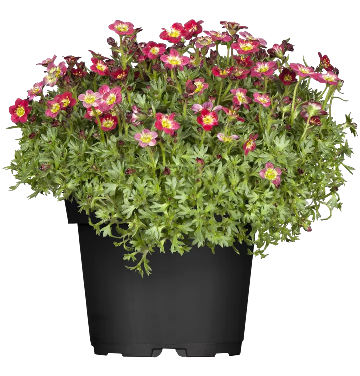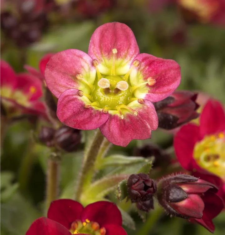 Saxifraga x arendsii bildet schalenförmige, rosafarbene, rote, weiße Blüten ab April.