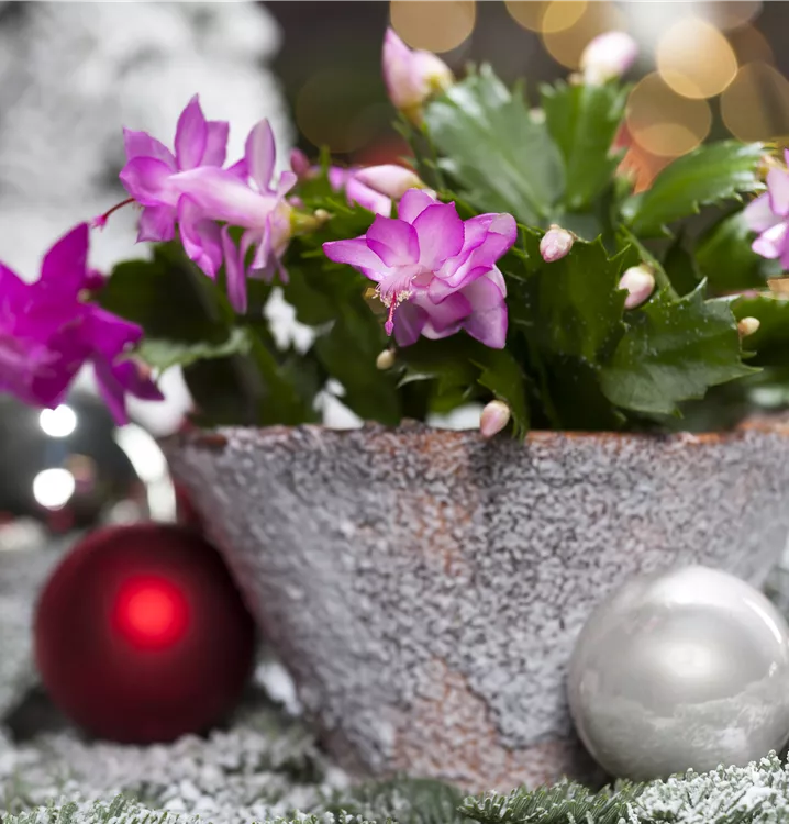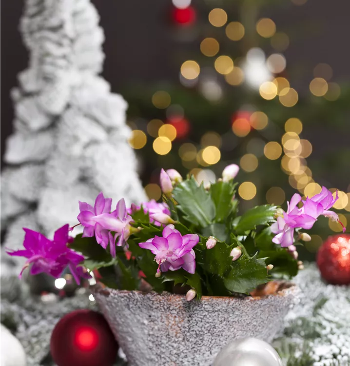 Der Weihnachts-Kaktus (Schlumbergera bridgesii) ist eine Pflanze mit dunkelgrünen, dickfleischigen Blättern. Seine Blüten sind weiß, rosa oder rot und erscheinen von Dezember bis Februar. Diese aufrechte Pflanze gedeiht am besten an einem sonnigen bis halbschattigen Standort.