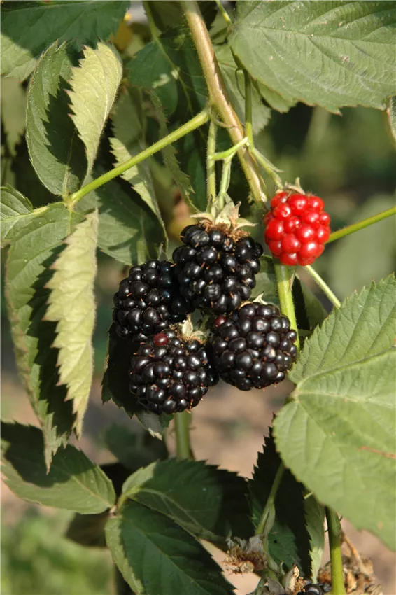 Seitentriebe, an denen im Vorjahr Brombeeren wuchsen, sollten entfernt werden. Denn sie tragen nur einmal, sterben dann ab und machen damit Platz für neue Triebe, an denen dann neue Früchte wachsen. Sind die Früchte vollreif, lassen sie sich leicht vom Strauch lösen, sind gänzlich schwarz und schmecken fruchtig-süß.